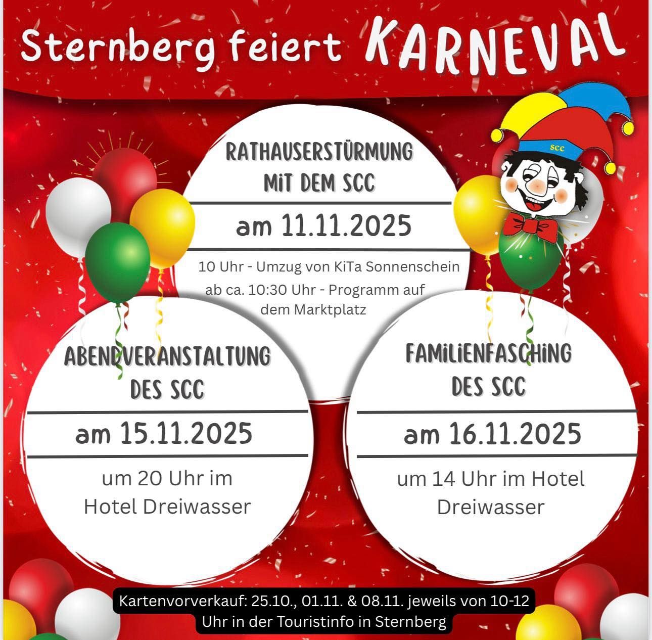 Der Sternberger Carnevalclub (SCC) steckt voller Vorfreude und startet am 11. November traditionell in die fünfte Jahreszeit. Los geht es bereits um 10:00 Uhr mit einem bunten Umzug ab der Grundschule. Pünktlich um 11:11 Uhr wird dann die Rathaus-Erstürmung stattfinden – man darf gespannt sein, welche Ideen sich der SCC diesmal einfallen lässt, um an den begehrten Rathausschlüssel zu kommen. Weiter geht es am Samstag, den 15. November, mit der großen Abendveranstaltung im Hotel Dreiwasser. Am Sonntag, den 16. November, lädt der SCC dann zum fröhlichen Familienfasching ein – ebenfalls im Hotel Dreiwasser. Ein ganz besonderes Highlight: Das neue Prinzenpaar wird am 11. November feierlich vorgestellt. Kommt vorbei, feiert mit uns, lasst den Alltag hinter euch und genießt die närrische Zeit – der SCC freut sich auf euch!